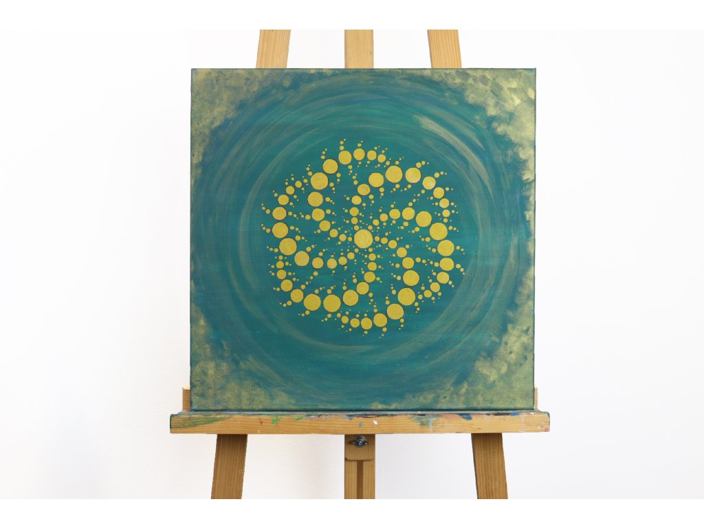 Obraz s metalickým zlatým efektem nesoucí jemné kruhové vzory, inspirovala jsem se kruhy v obilí. Sděluje mám skrytý příběhů.