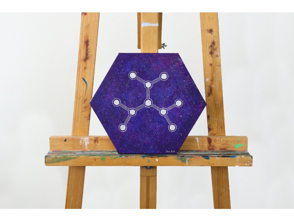 Tajný vzkaz – akrylová malba na plátně, hexagon o straně 16 cm.