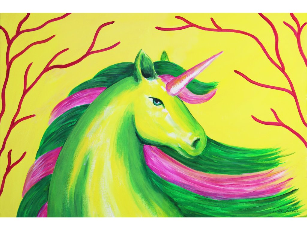 Kopie obrazu Jednorožka o rozměru 40x30 cm. Jedná se o tisk na plátně, barvy se můžou lehce lišit i podle barevnosti vaší obrazovky.